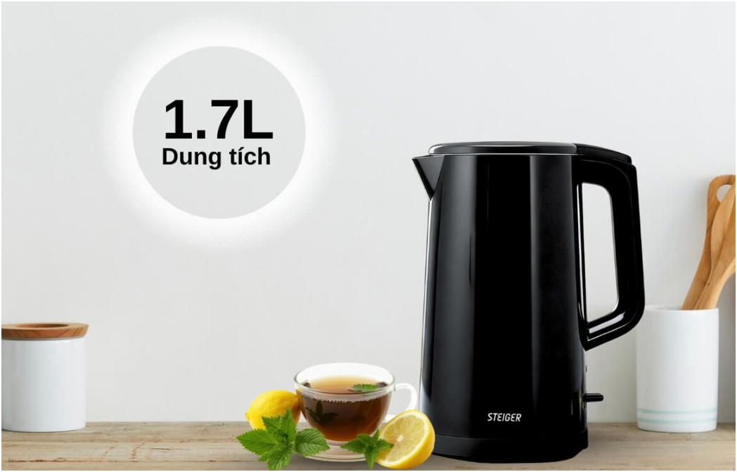 Ấm siêu tốc Steiger STG-9238/B dung tích 1,7 lít, đáp ứng đủ nhu cầu nước nóng cho cả gia đình như nấu mì, pha trà, cà phê… Ngoài ra còn có thể đun sôi nước để nguội để uống hàng ngày. Với dung tích này, ấm phù hợp với nhiều người dùng khác nhau, từ nhu cầu cá nhân đến gia đình 2 – 4 người.