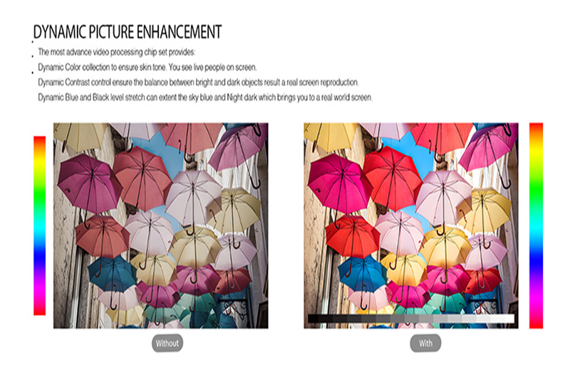 Với công nghệ tăng cường độ sáng, TV TCL40S6800 có thể tăng cường độ sáng để cung cấp hình ảnh tự nhiên hơn và đảm bảo rằng bạn có thể nhìn thấy hình ảnh rõ nét dưới ánh sáng mặt trời. Thêm vào đó công nghệ Dynamic Picture Enhancement giúp cải thiện hình ảnh động với dải màu rộng hơn, cho hình ảnh sống động, rực rỡ.
