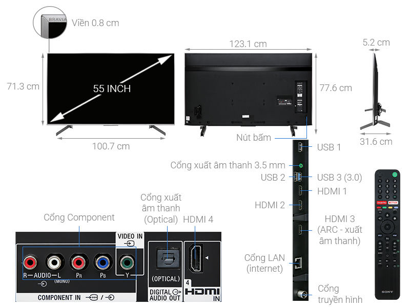 Kích thước màn hình lớn giúp bạn dễ dàng bố trí tivi Sony 55 inch ở phòng khách, phòng làm việc hay treo tường trên phòng họp đều thích hợp.