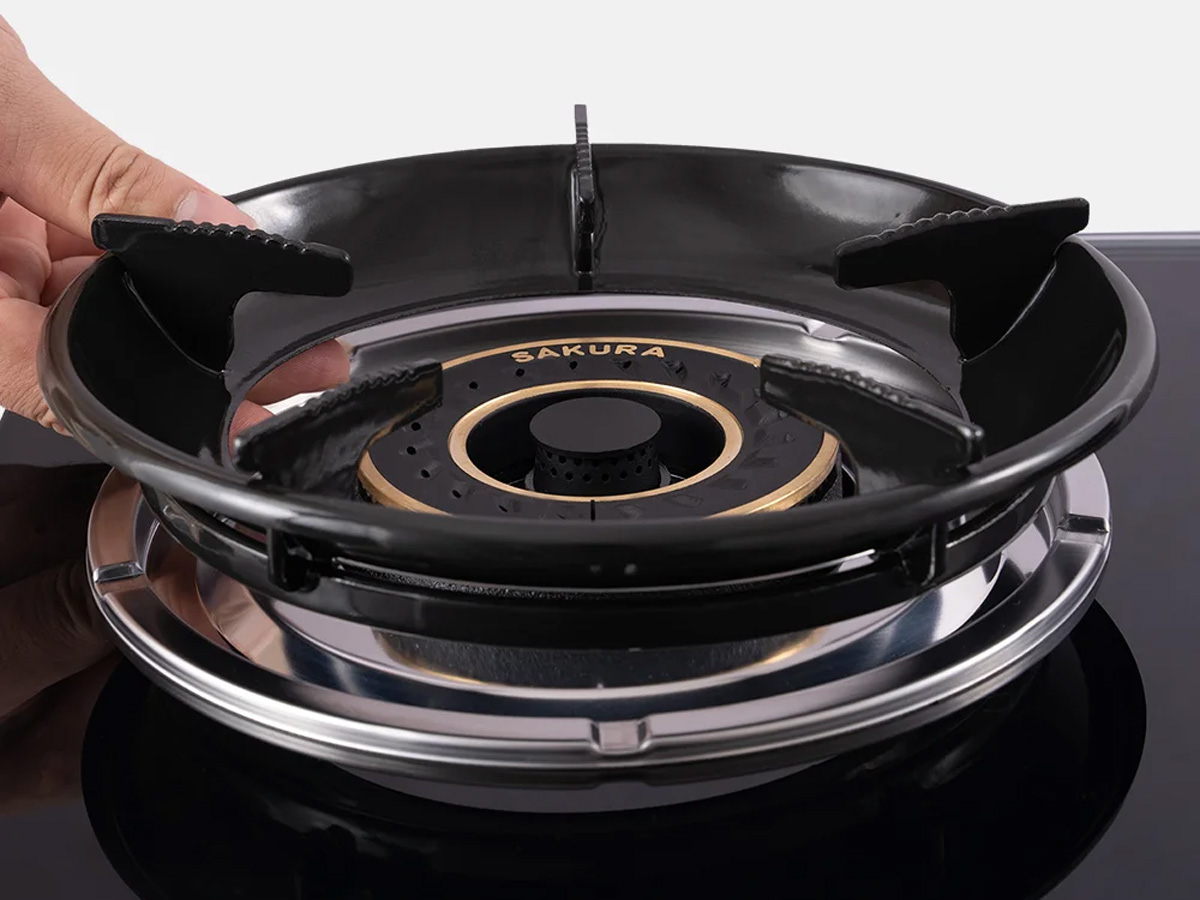 Bếp gas Sakura SA-2377HG có kiềng thép tráng men 5 chân giúp cố định nồi, chảo chắc chắn, không lo trơn trượt trong khi nấu. Bên cạnh đó, thiết kế vòng chắn gió thông minh giúp ngọn lửa ổn định, không bị tạt khi có gió, từ đó rút ngắn thời gian đun nấu và tiết kiệm nhiên liệu hơn.