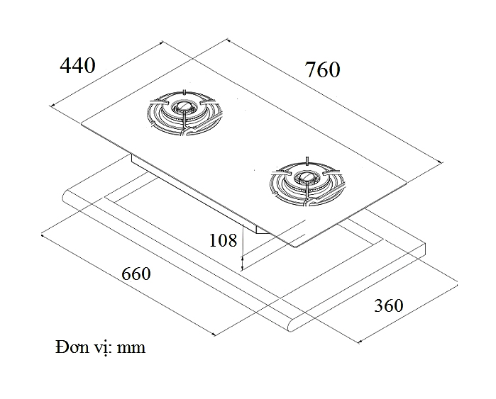 Bếp gas âm kính 2 lò GrandX GX GS288 có kích thước là R760 x S440 x C108 (mm). Kích thước khoét đá lắp âm là R660 x S360 (mm). Sản phẩm này được sản xuất và nhập khẩu nguyên chiếc chính hãng từ GrandX.