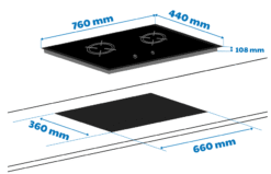 Bếp gas âm kính 2 lò GrandX GX GS299D có kích thước là R760 x S440 x C108 (mm). Kích thước khoét đá lắp âm là R660 x S360 (mm). Sản phẩm này được sản xuất và nhập khẩu nguyên chiếc chính hãng từ GrandX.