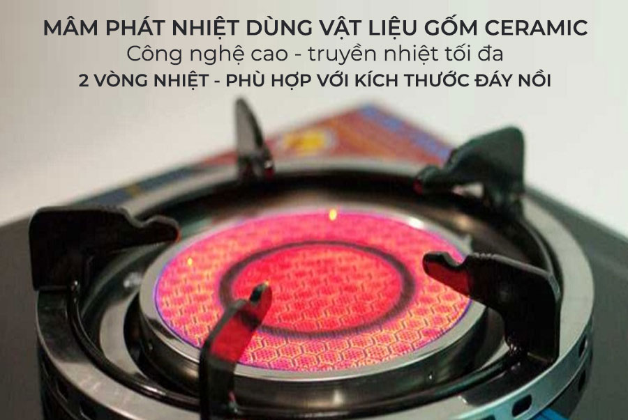 Mâm chia lửa 2 vòng nhiệt, truyền nhiệt bằng bức xạ nhiệt hồng ngoại vì vậy bếp cháy đỏ màu hồng mà không có ngọn lửa, không bị gió thổi tắt đồng thời không để lại muội đen bám ở đáy nồi.