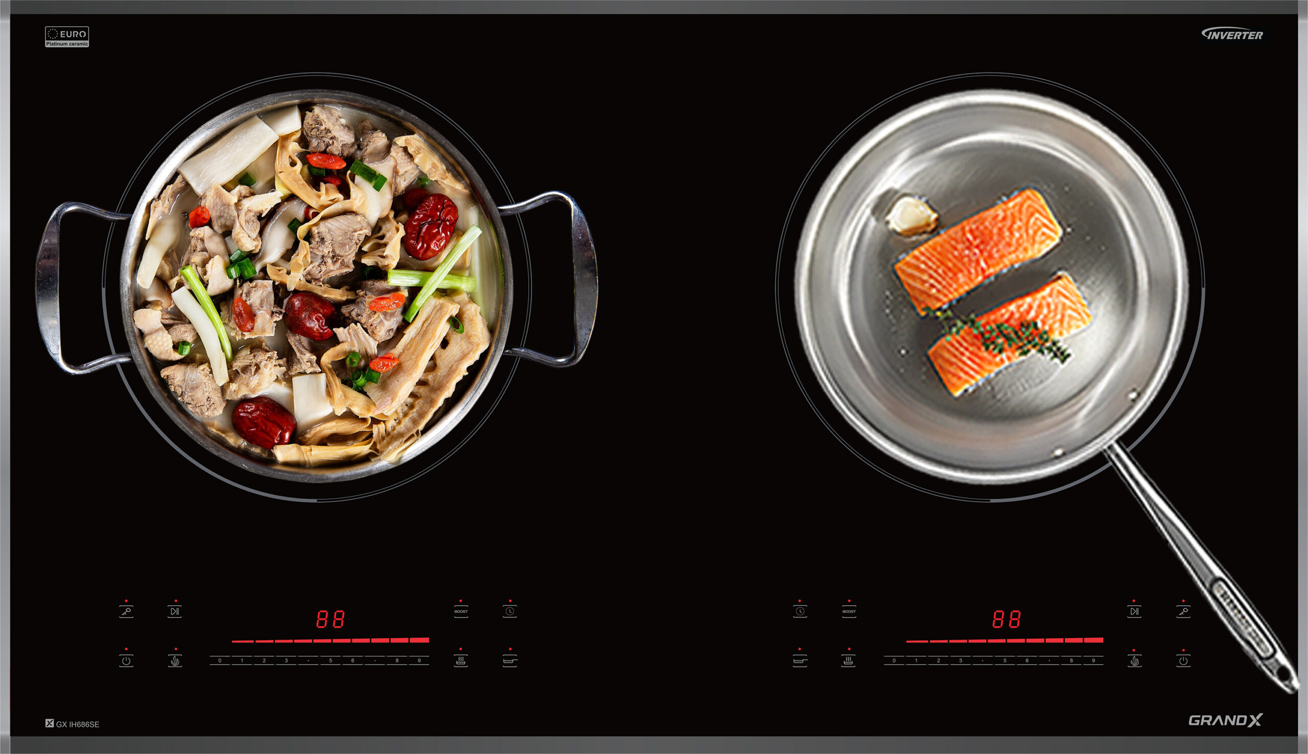 Bếp từ GrandX GX IH686SE được trang bị 2 vùng nấu cảm ứng từ với công suất mạnh mẽ: