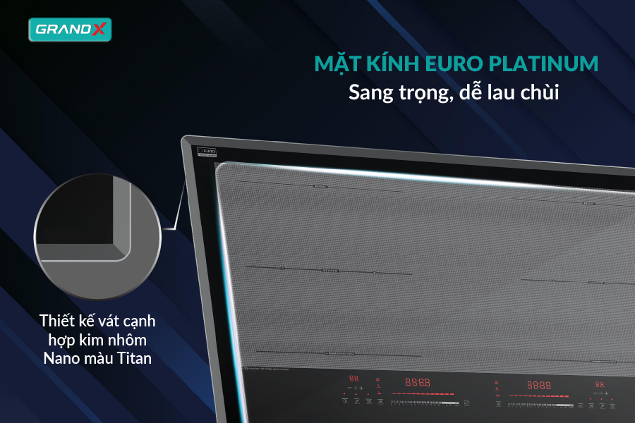 Mặt kính EURO Platinum: Chất liệu kính cao cấp được vát 4 cạnh kết hợp với viền hợp kim nhôm Alloy Carbon 3D mạ Nano màu Titan, tạo nên sự bền bỉ và đẳng cấp.