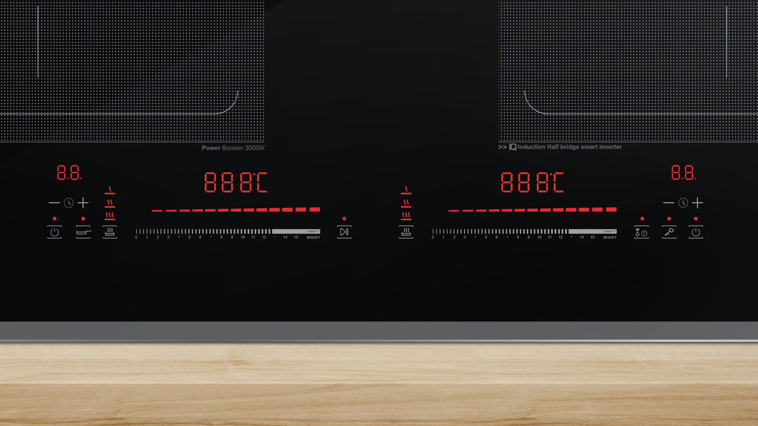- Booster tăng tốc 3.000W: Tăng công suất tức thời cho 2 vùng nấu, rút ngắn thời gian đun nấu.