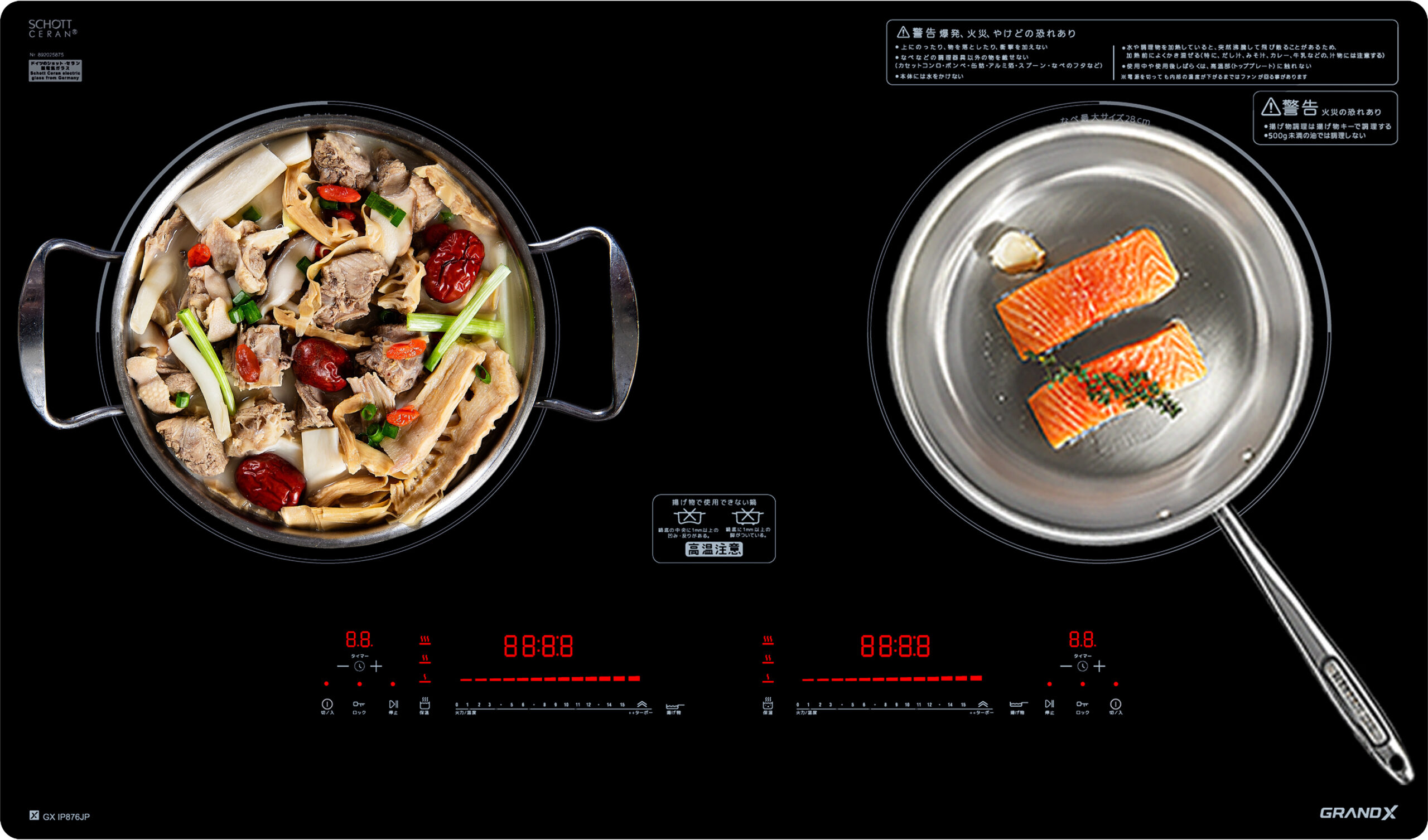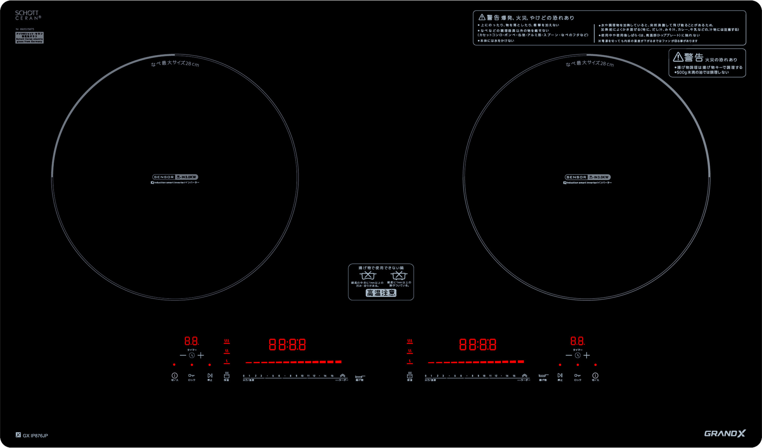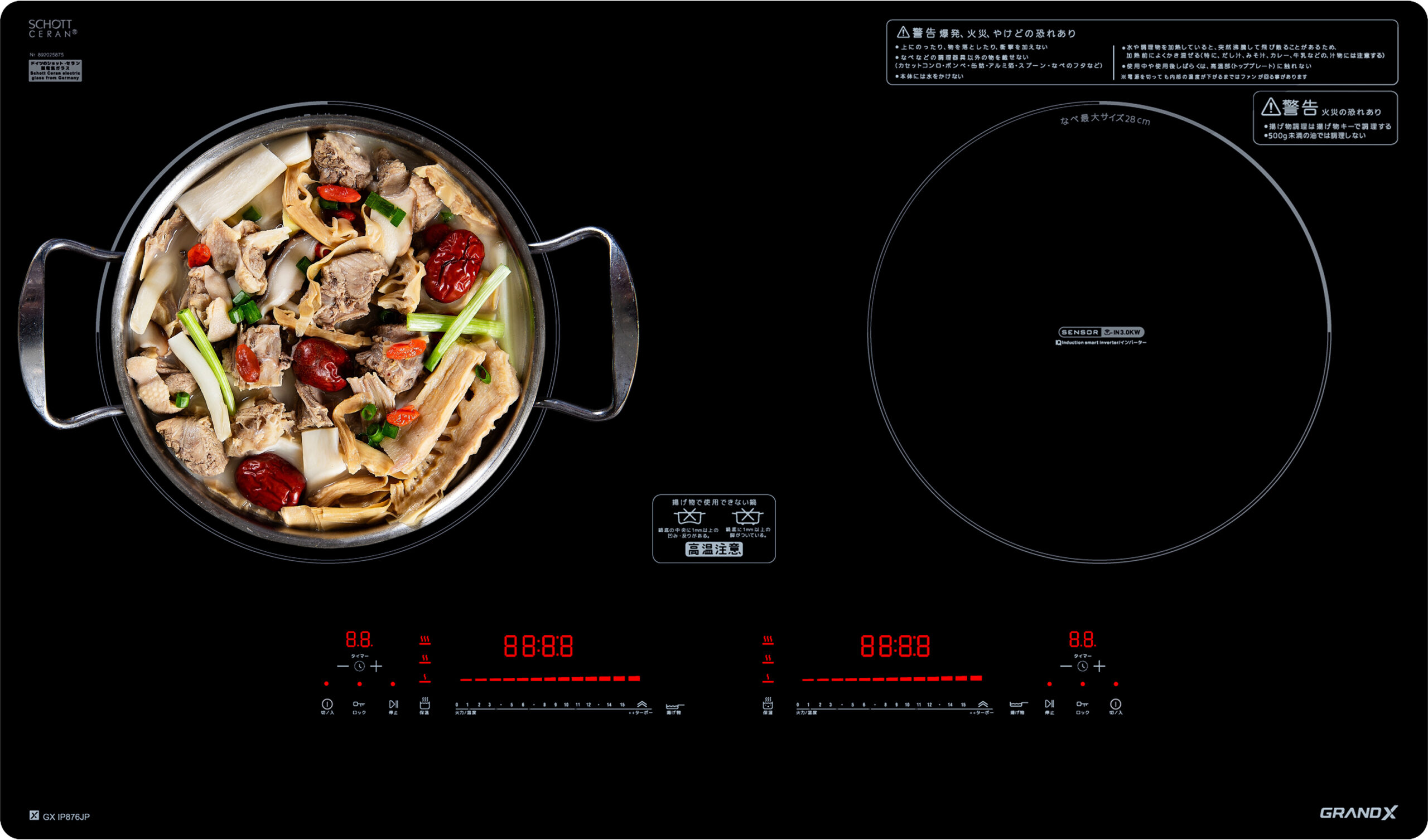 Bếp từ 2 vùng nấu GrandX GX IP876JP với thiết kế sang trọng, tinh tế cùng các tính năng nổi trội, hứa hẹn sẽ là một người bạn đồng hành tin cậy cho các bữa ăn gia đình. Sản phẩm được nhập khẩu nguyên chiếc từ Malaysia theo tiêu chuẩn công nghệ Nhật Bản.