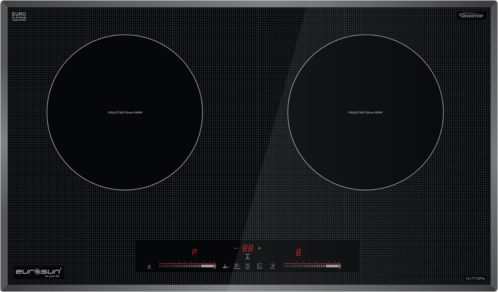 Bếp từ Eurosun EU-T710Pro Silver | Màu bạc là một trong những bếp từ đôi ĐẦU TIÊN trên thị trường Việt Nam tích hợp công nghệ Inverter trên 2 vùng nấu. Bếp được trang bị 2 vùng nấu điều khiển độc lập công suất nhưng san tải 3600W nhờ IC công suất thế hệ thứ mới