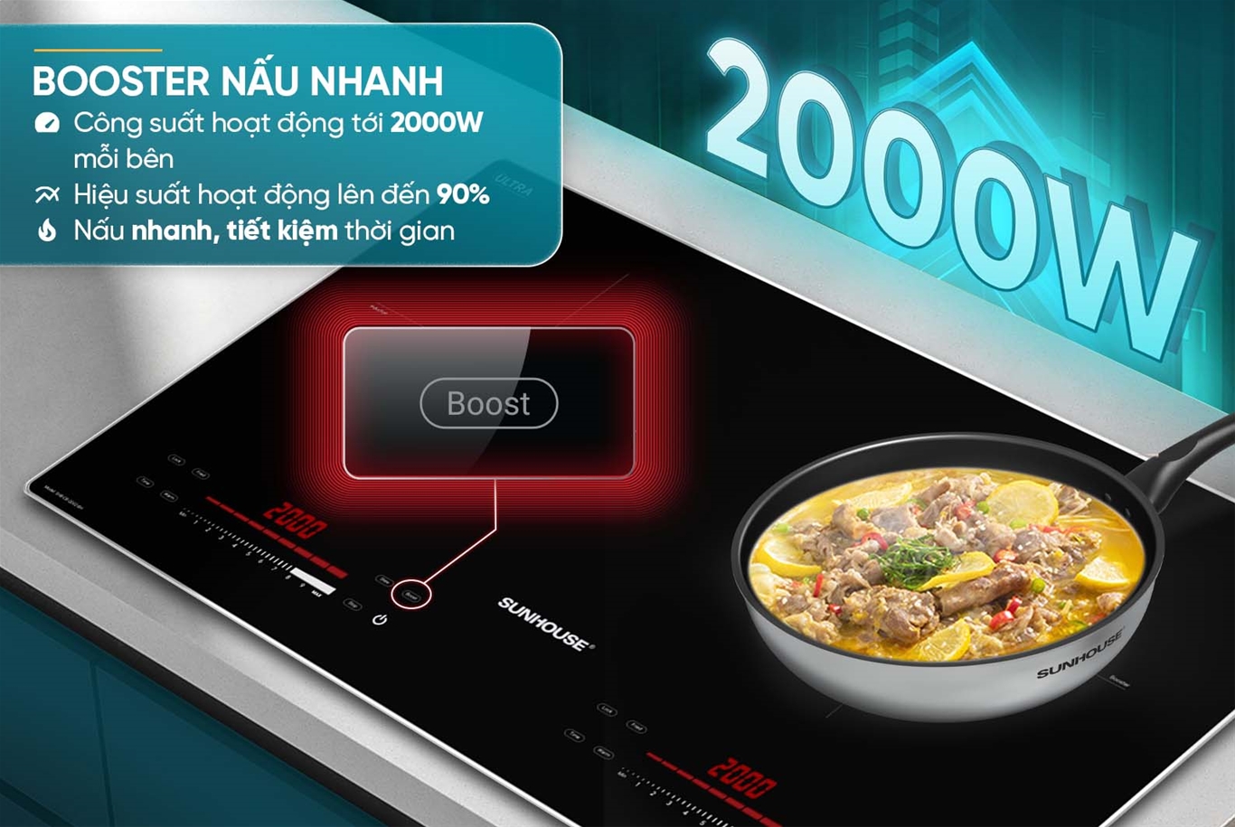 Chức năng nấu nhanh – BOOSTER giúp bếp đẩy lên mức công suất cực đại nhanh nhất tới 2000W, giúp gia nhiệt nhanh chóng và cho hiệu suất hoạt động lên đến 90% so với các bếp từ thông thường. Chức năng Booster cho phép tăng công suất lên mức cao nhất trong thời gian ngắn, giúp nhiệt độ tăng nhanh chóng và nấu nướng được thực hiện một cách hiệu quả. Điều này giúp tiết kiệm thời gian và làm việc nhanh hơn trong bếp.