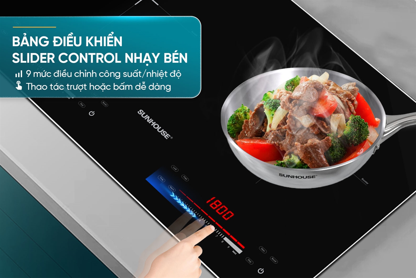 Bếp có 9 mức điều chỉnh nhiệt độ/công suất với 2 bảng điều khiển riêng biệt cho từng vùng nấu. Mặt điều khiển SLIDER CONTROL cảm ứng nhạy bén giúp điều chỉnh nhiệt độ và các chế độ nấu nhanh chóng và thuận tiện chỉ với 1 thao tác. Người dùng thực hiện thao tác trượt tay sang trái hoặc sang phải để tăng/giảm và điều chỉnh nhiệt độ, công suất hoặc thời gian. Điều khiển cảm ứng trượt dễ dàng sử dụng, phù hợp với mọi đối tượng.