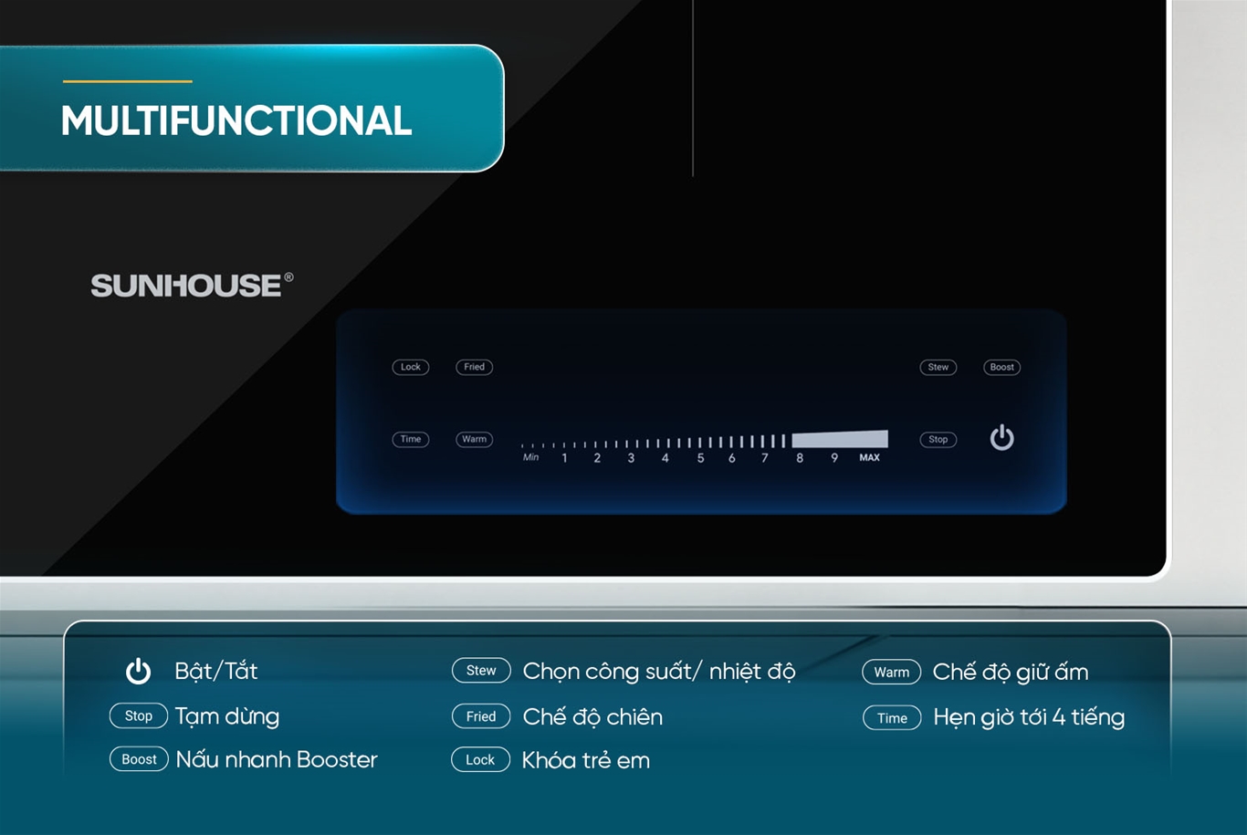 - Cảnh báo quá nhiệt/nồi cạn: Bếp từ Sunhouse được thiết kế cảm biến nhiệt độ dưới mỗi vùng nấu, khi có hiện tượng quá nhiệt (nồi đun bị cạn, cháy…) bếp sẽ chủ động ngắt công suất để đảm bảo an toàn cho thiết bị cũng như đảm bảo không sự cố đáng tiếc xảy ra.