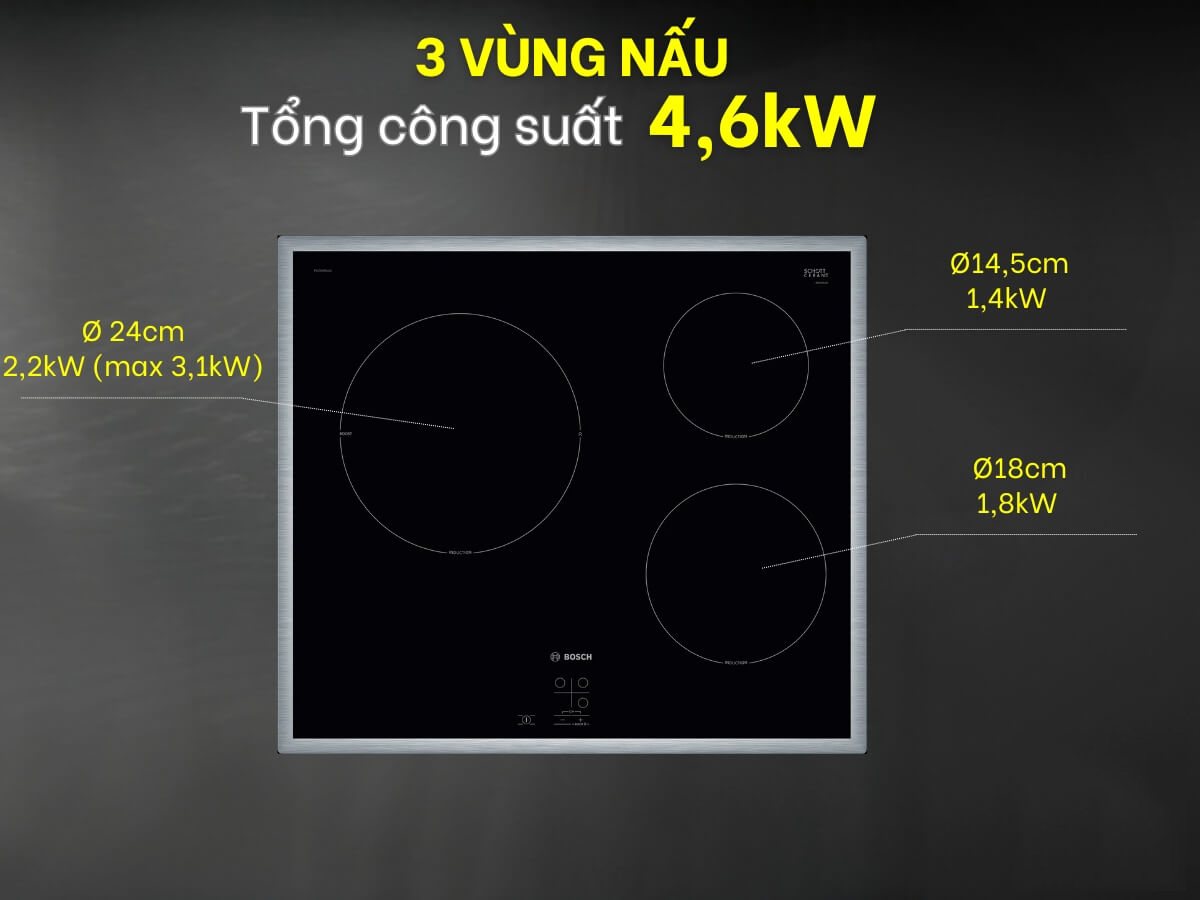 Bếp từ Bosch PUC64RAA5E được thiết kế với 3 vùng nấu tổng công suất 4,6kW (4600W), cho phép nấu nướng cùng lúc 3 món với khả năng đun nấu nhanh, hiệu quả và tiết kiệm thời gian, đem đến sự tiện lợi tối đa cho người dùng. Kích thước và công suất vùng nấu:
