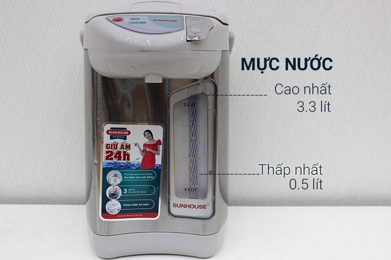 Bình thủy điện Sunhouse SHD1533 3.3 lít có thang đo mực nước giúp bạn dễ dàng quan sát lượng nước bên trong