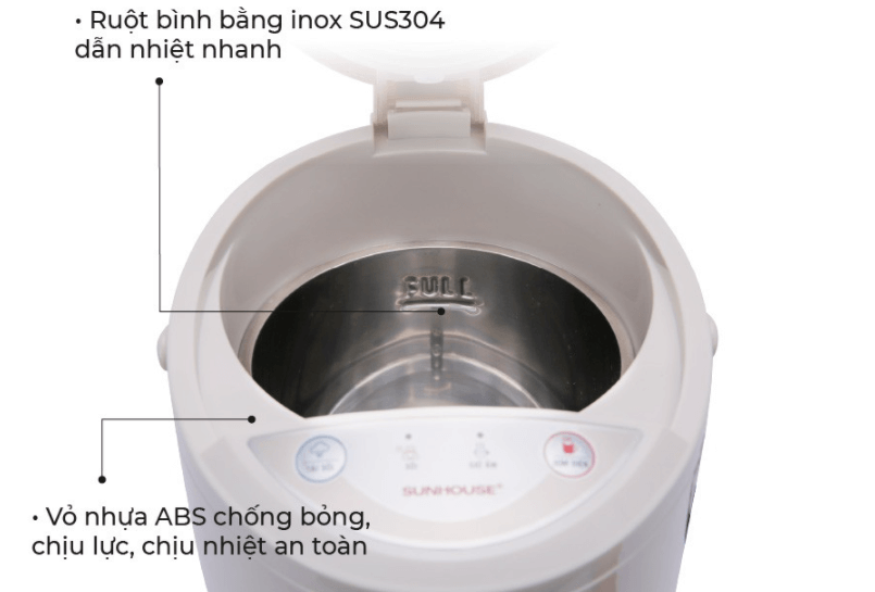 Ruột của bình được làm từ chất liệu inox SUS304 (thép không gỉ) cao cấp, có khả năng dẫn nhiệt nhanh giúp rút ngắn thời gian đun sôi nước. Đồng thời, chất liệu này sẽ không bị oxy hóa nên hạn chế hiện tượng bám cặn dưới đáy bình sau một thời gian dài sử dụng, đảm bảo sức khỏe cho người dùng.