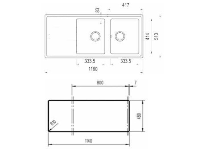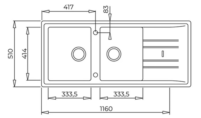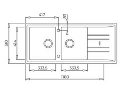 Kích thước tổng thể của chậu là 1.160 x 510 x 200 mm giúp dễ dàng lắp đặt vào các khu vực bếp rộng rãi, trong khi các hộc rửa có kích thước 334 x 414 x 200 mm đủ rộng để phục vụ nhiều nhu cầu sử dụng khác nhau.