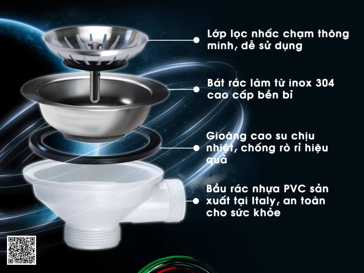 - Hố Rác Kích Thước Lớn: 114 mm, với 2 lớp lọc chống tắc, phù hợp với thói quen sử dụng của người Việt.