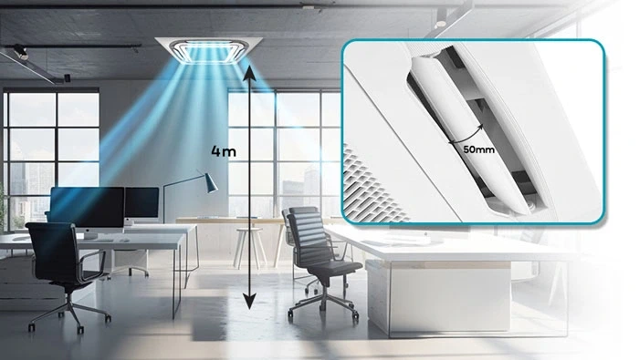 Sở dĩ có được điều này là bởi máy lạnh có khả năng thổi gió 360 độ với độ xa tới 4m giúp phân tán không khí mát lạnh tới mọi ngóc ngách trong căn phòng, mang đến sự thoải mái dễ chịu cho người tiêu dùng.