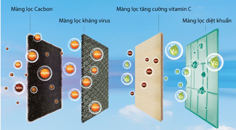 Điều hòa 18000BTU Casper SH-18FS32 2 chiều sở hữu hệ thống lưới lọc đa chiều Air Fresh có 4 màng lọc chính: màng lọc Cacbon, màng lọc kháng virus, màng lọc tăng cường Vitamin C và màng lọc diệt khuẩn bắt giữ sẽ loại bỏ bụi bẩn, vi khuẩn và các tác nhân gây hại khác để cho bầu không khí trong lành, sạch khuẩn.