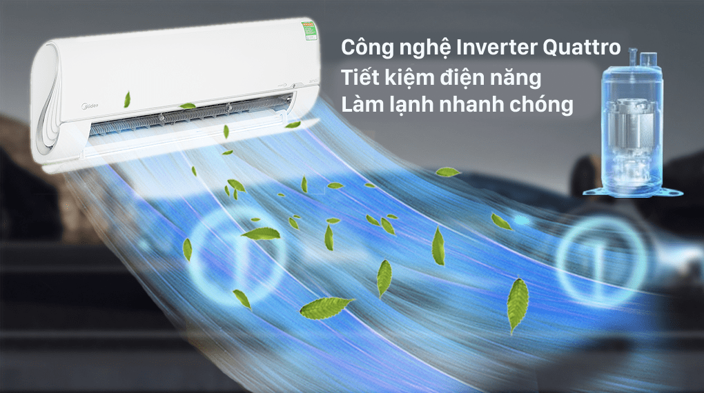 Máy lạnh Midea được tích hợp công nghệ Inverter Quattro hiện đại không chỉ đem lại khả năng vận hành êm ái mà còn giúp tiết kiệm điện năng trong quá trình sử dụng. Ngoài ra, công nghệ này còn có thể làm lạnh nhanh chóng với 40s, người dùng không phải chờ đợi lâu trong những ngày nắng nóng khó chịu.