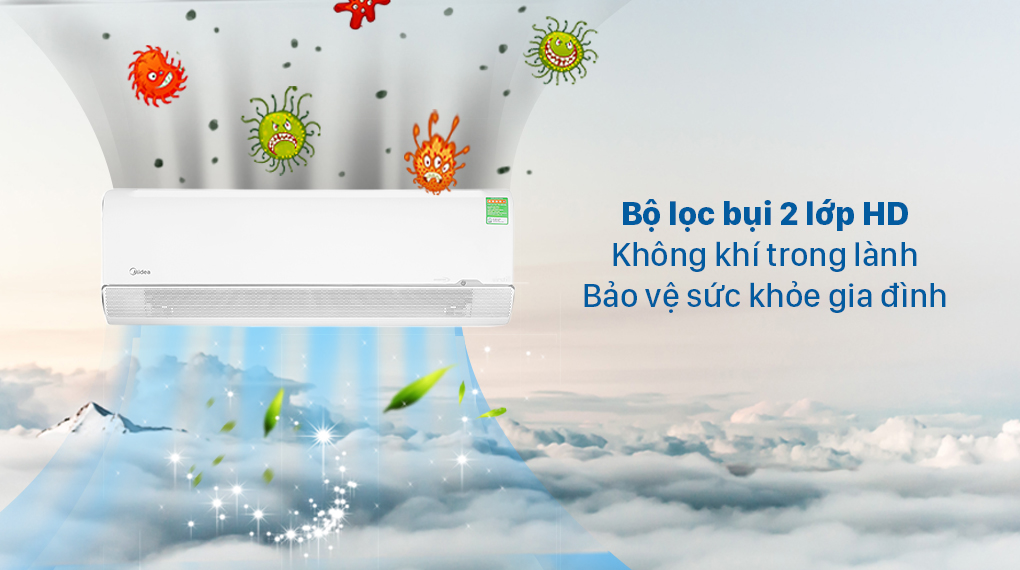 Với thiết kế siêu nhỏ của bộ lọc bụi 2 lớp HD trên máy lạnh Midea sẽ giúp loại bỏ được 50% các tác nhân gây dị ứng như: phấn hoa, lông thú cưng, bụi bẩn trong không khí,… Mang đến cho căn phòng có bầu không khí trong lành, giúp bảo vệ sức khỏe cho các thành viên trong gia đình.