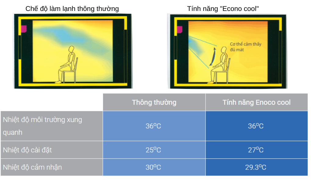 Tính năng Econo cool tự động điều chỉnh hướng gió dựa trên nhiệt độ tại cửa gió và tăng hiệu quả tiết kiệm năng lượng lên 20%