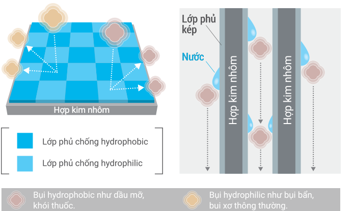 Công nghệ lớp phủ kép chống bám bẩn độc quyền trên máy lạnh Mitsubishi Electric giúp ngăn ngừa tích tụ bụi bẩn, khói thuốc và dầu mỡ trên bề mặt giúp thiết bị luôn sạch.