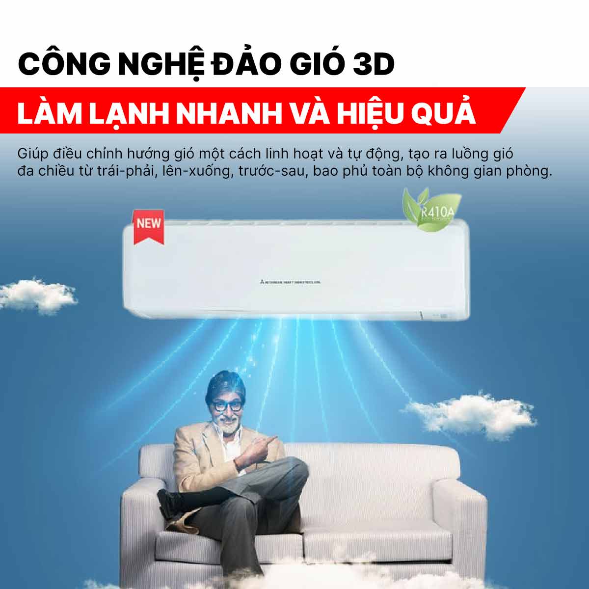 Công nghệ đảo gió 3D trên điều hòa Mitsubishi giúp điều chỉnh hướng gió một cách linh hoạt và tự động, tạo ra luồng gió đa chiều từ trái-phải, lên-xuống, trước-sau, bao phủ toàn bộ không gian phòng. Từ đó mang lại khả năng làm lạnh nhanh chóng và hiệu quả. Đồng thời phân phối không khí lạnh một cách đồng đều trong phòng.