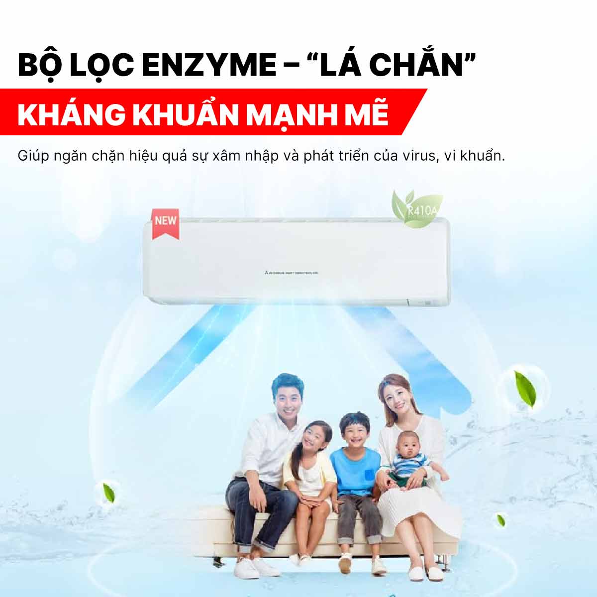 Tấm lọc Enzyme cao cấp được Mitsubishi Heavy nghiên cứu và phát triển, giúp ngăn chặn hiệu quả sự xâm nhập và phát triển của virus, vi khuẩn. Khi không khí đi qua bộ lọc, vi khuẩn sẽ bị giữ lại nhờ lực hút tĩnh điện, sau đó nhanh chóng bị phá vỡ cấu trúc dưới tác động của ánh sáng. Nhờ đó, không khí trong phòng luôn sạch sẽ, trong lành và an toàn hơn cho sức khỏe cả gia đình.