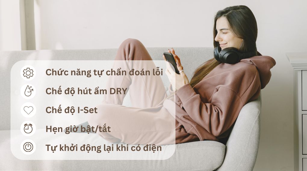 – Chế độ hút ẩm (DRY): giúp giảm cảm giác oi bức, phù hợp sử dụng trong mùa mưa ẩm ướt, mùa hè và mùa đông đặc biệt là mùa nồm.