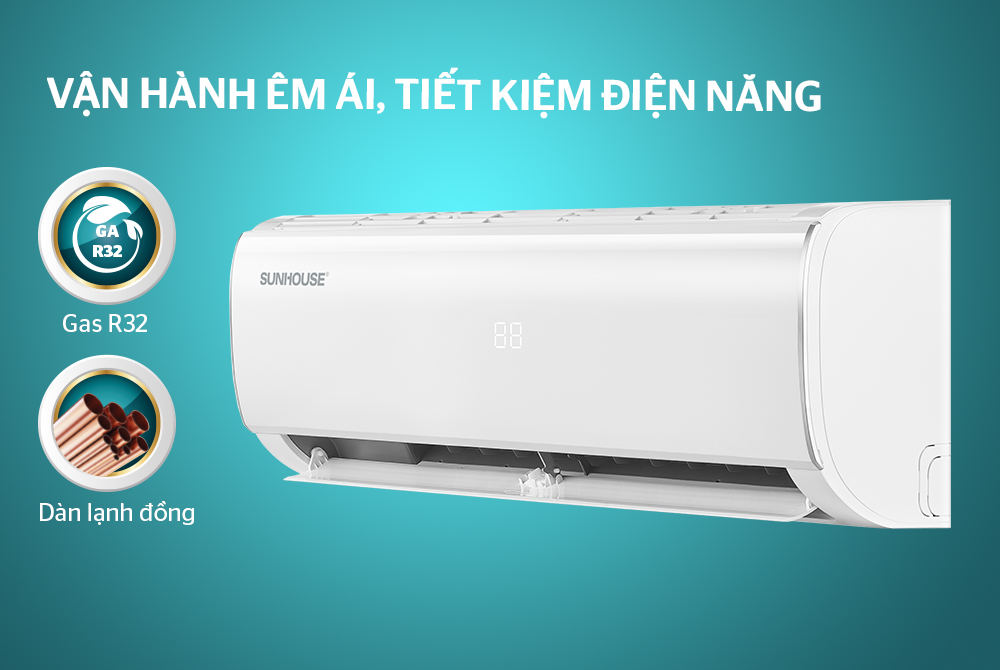 Điều hòa SUNHOUSE sử dụng dàn lạnh ống đồng và môi chất lạnh gas R32. Môi chất lạnh gas R32 đem đến hơi lạnh sâu, làm lạnh nhanh chóng. Kết hợp cùng dàn lạnh ống đồng có khả năng giữ nhiệt tốt, giảm rò rỉ môi chất lạnh, điều hòa SUNHOUSE giúp người dùng có thể nhanh chóng tận hưởng hơi lạnh êm ái, dễ chịu.