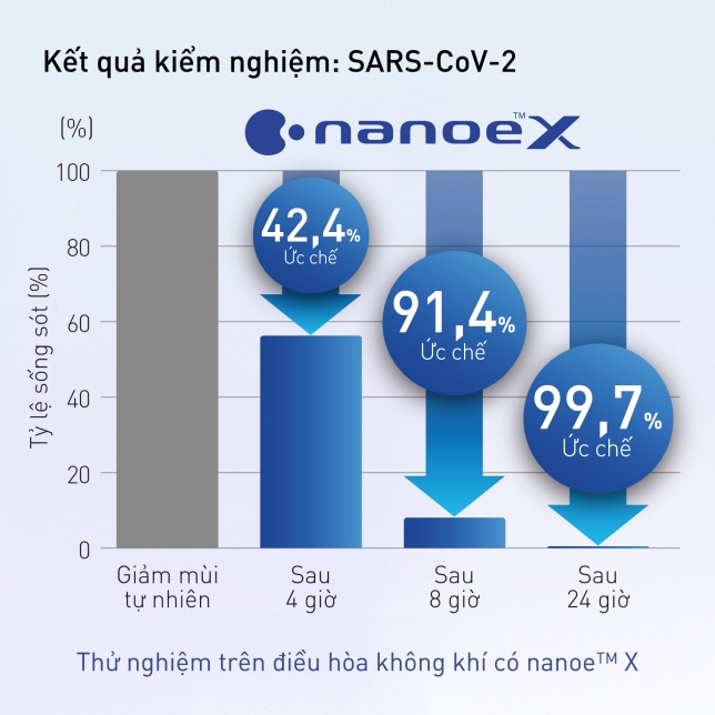 Tổ chức nghiên cứu theo hợp đồng toàn cầu Texcell đã xác nhận rằng công nghệ nanoe™ X với khả năng tạo gốc hydroxyl giúp ức chế hiệu quả vi-rút corona chủng mới (SARS-CoV-2) bám trên bề mặt. 99,7% hoạt động của vi-rút corona chủng mới (SARS-CoV-2) bám trên bề mặt bị ức chế trong vòng 24 giờ trong không gian thử nghiệm 6,7 m³.