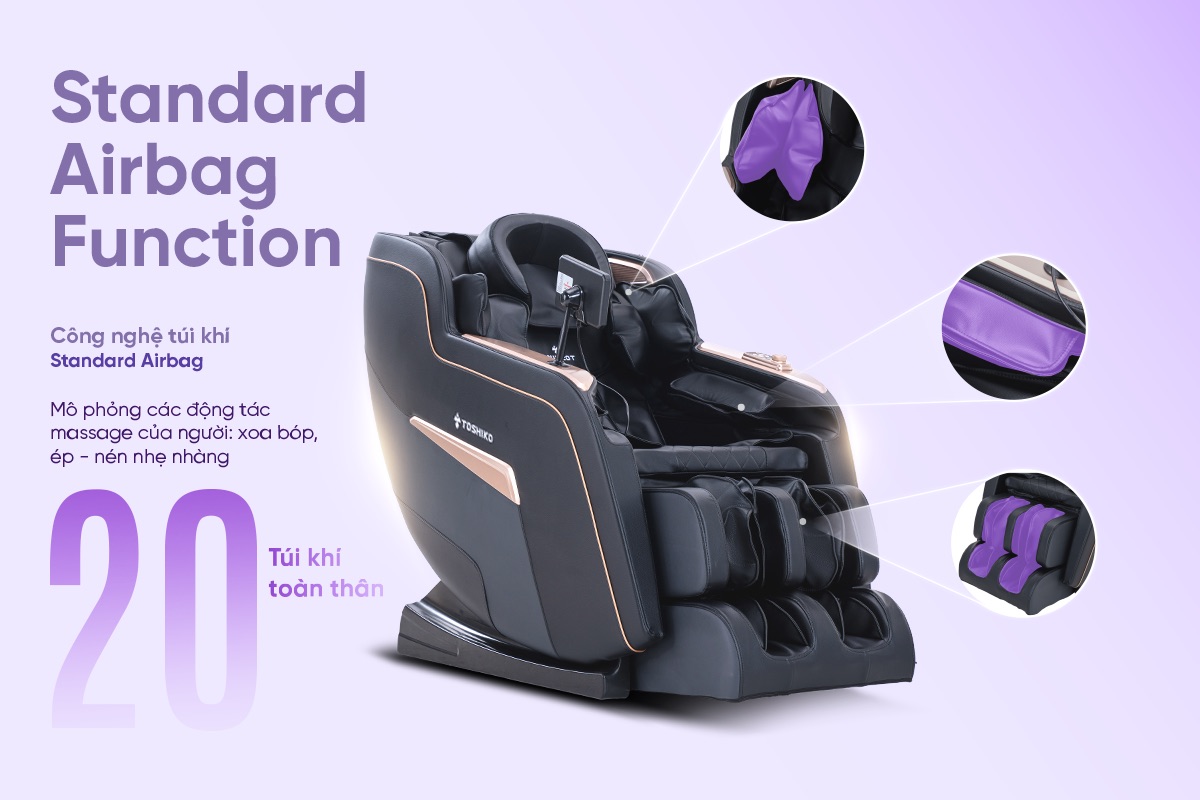 Toshiko T82 được trang bị công nghệ túi khí hiện đại Standard Airbag Function, với 20 túi khí đa tầng được bố trí chiến lược tại các vùng trọng yếu như thái dương, vai, bắp tay, mông, bắp chân và bàn chân. Hệ thống này được phát triển dựa trên nghiên cứu chuyên sâu về cấu trúc hình thể và hệ thống huyệt đạo của cơ thể người.