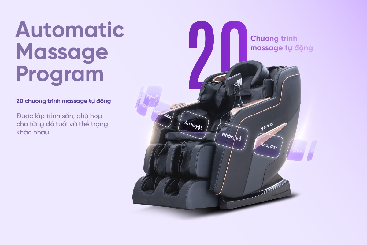 Toshiko T82 tích hợp 20 chương trình massage tự động, được thiết kế chuyên biệt để đáp ứng đầy đủ nhu cầu người dùng: từ thư giãn nhẹ nhàng, kéo giãn sâu, đến các kỹ thuật massage chuyên nghiệp như vỗ, nhào, xoa, ép, đấm… Mỗi bài tập được lập trình bài bản, phù hợp cho từng độ tuổi và thể trạng khác nhau.
