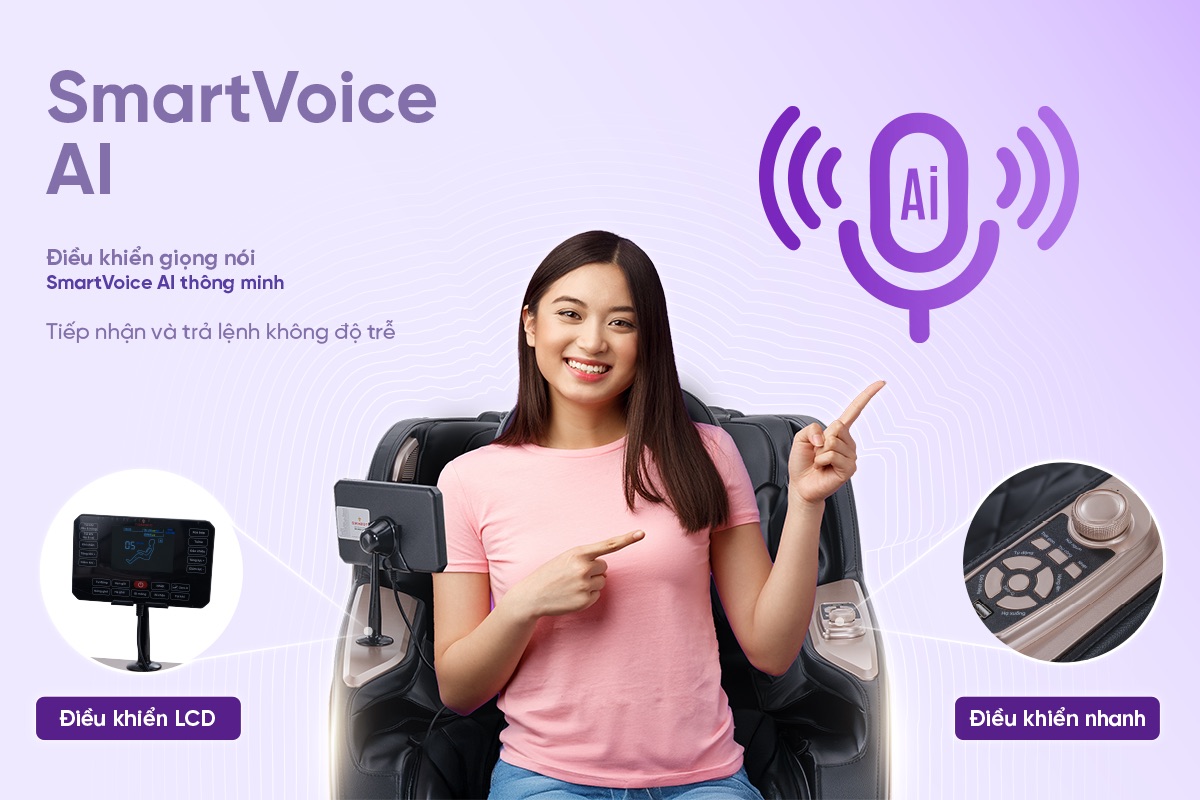 T82 sở hữu hệ thống điều khiển giọng nói SmartVoice AI thông minh, tốc độ phản hồi chỉ dưới siêu nhanh, nhận diện chính xác các câu lệnh. Người dùng không cần chạm tay, chỉ cần nói, ghế sẽ tự động thực hiện theo. Bên cạnh đó, ghế còn có nút điều khiển nhanh trên tay ghế và màn hình LCD cảm ứng, trực quan và dễ sử dụng, phù hợp với cả người cao tuổi và người có thị lực yếu.