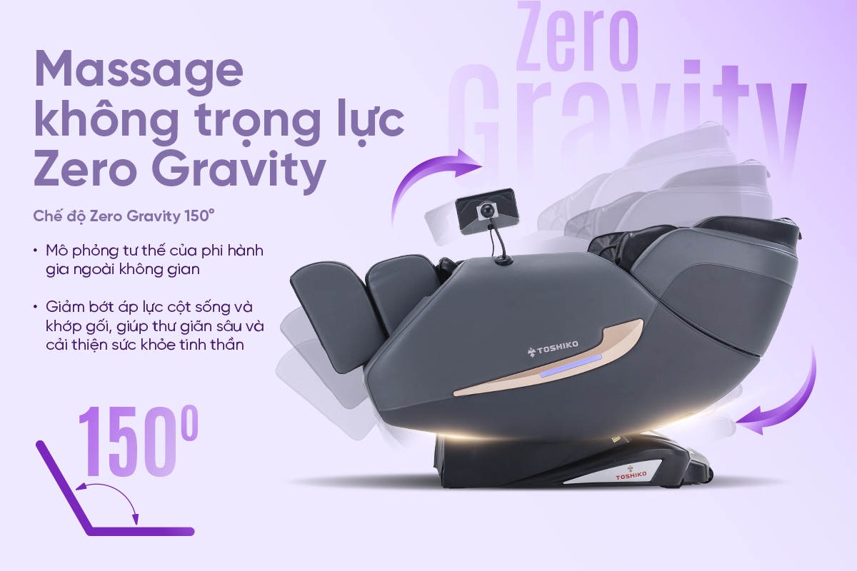 Chế độ Zero Gravity 150° mô phỏng tư thế của phi hành gia ngoài không gian, đưa thân người ngả sâu về phía sau, từ đó giúp giảm áp lực lên cột sống và khớp gối, thúc đẩy lưu thông máu và tái hydrat hóa các đĩa đệm cột sống. Đây là tư thế lý tưởng để thư giãn sâu, cải thiện giấc ngủ và hồi phục sau căng thẳng.