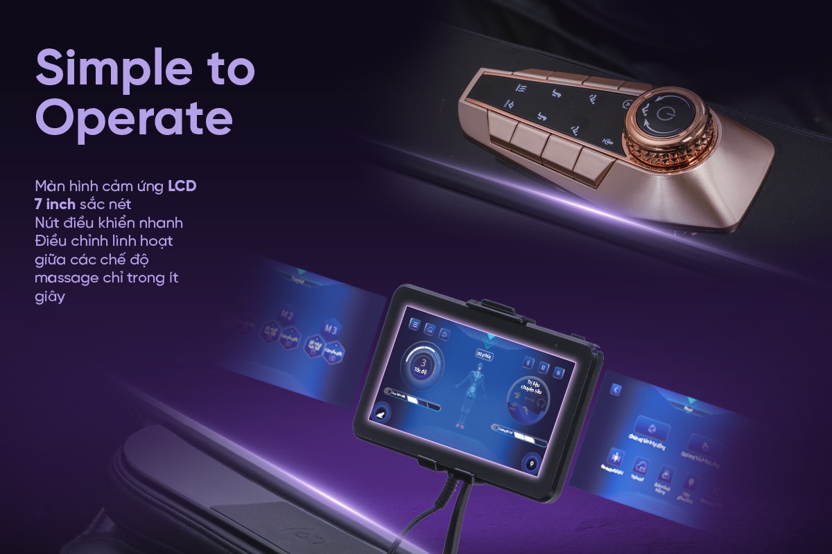 T96 tích hợp màn hình cảm ứng LCD 7 inch sắc nét, giao diện trực quan, cùng nút điều khiển nhanh trên tay ghế. Hỗ trợ điều chỉnh linh hoạt giữa các chế độ massage chỉ trong ít giây. Đặc biệt, hệ thống loa vòm HiFi chất lượng cao giúp bạn đắm chìm trong không gian âm nhạc sống động – như đang thư giãn giữa một rạp hát tại gia.