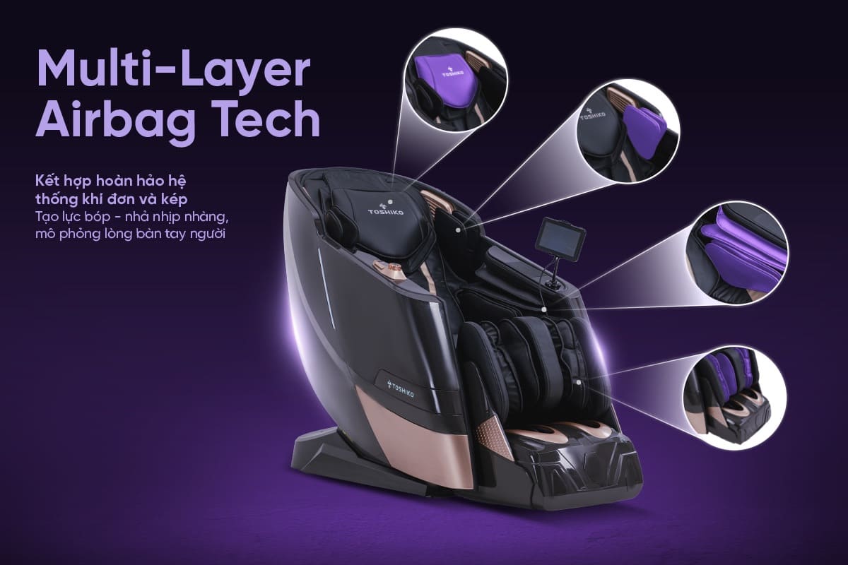 Sở hữu hệ thống túi khí toàn thân áp dụng công nghệ Multi-Layer Airbag Tech. Sự kết hợp hoàn hảo giữa túi khí kép (ở vùng vai, tay, lưng, eo) và túi khí đơn (ở vùng đùi, bắp chân, bàn chân) tạo lực bóp – nhả mô phỏng lòng bàn tay người, hỗ trợ giãn cơ, giải phóng áp lực cơ thể và mang lại cảm giác thư giãn sâu nhẹ nhàng.