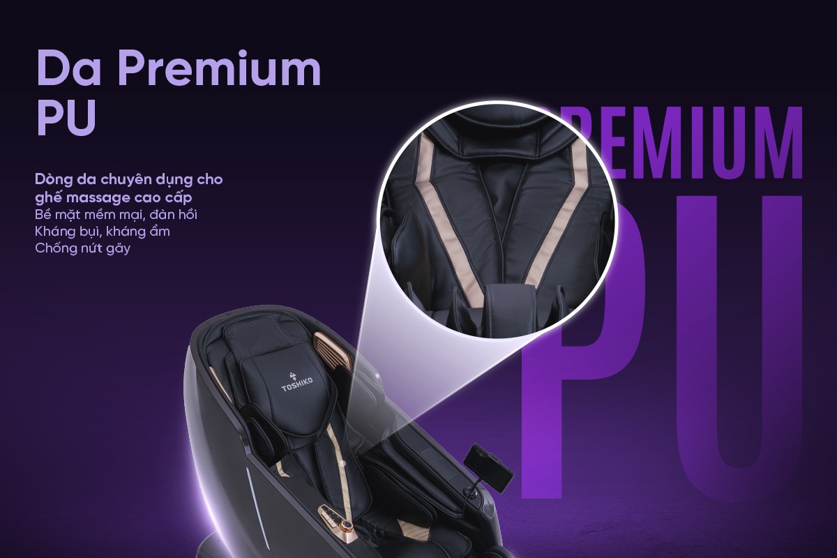 Toshiko T96 sử dụng chất liệu da Premium PU – loại da chuyên dụng cho ghế massage cao cấp. Với bề mặt mềm mại, đàn hồi tốt, khả năng kháng bụi – kháng ẩm và chống nứt gãy hiệu quả, Premium PU không chỉ đảm bảo độ bền mà còn giữ được vẻ sang trọng suốt thời gian dài sử dụng.