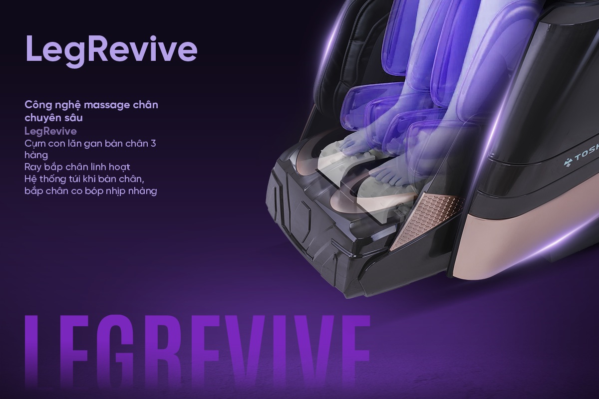 Toshiko T96 tích hợp hệ thống kéo giãn YogaStretch Function, tự động điều chỉnh chiều dài lên đến 14 cm, đảm bảo sự vừa vặn với mọi thể trạng người dùng. Bên cạnh đó, T96 cũng trang bị thêm công nghệ massage chân chuyên sâu LegRevive cho hiệu quả chăm sóc vượt trội. Cụm con lăn gan bàn chân 3 hàng và ray bắp chân linh hoạt tác động sâu vào các huyệt đạo phản xạ quan trọng, cùng lúc túi khí bắp chân, bàn chân liên tục co bóp, giúp giảm đau mỏi, tăng cường lưu thông máu và hỗ trợ điều trị tê bì chân hiệu quả.
