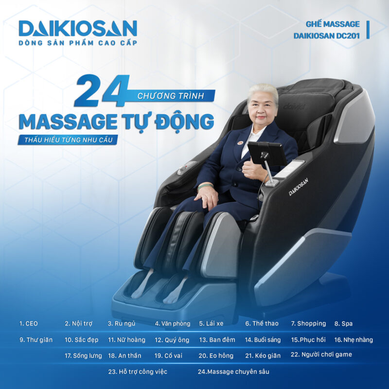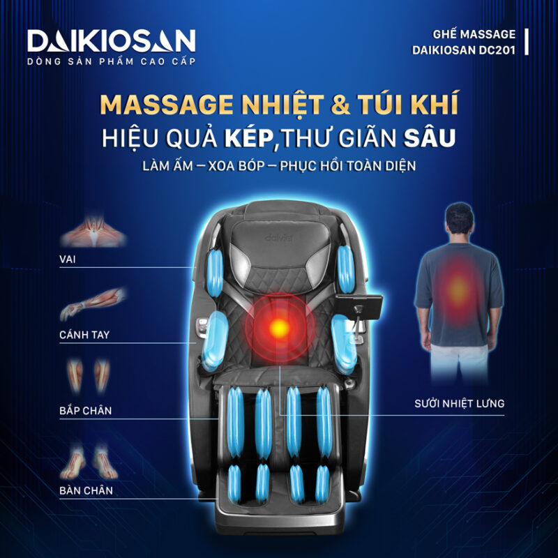 Ghế massage Daikiosan DC201 ứng dụng công nghệ massage 3D, là lựa chọn lý tưởng cho những ai tìm kiếm một thiết bị chăm sóc sức khỏe tại nhà vừa tiện nghi, vừa chuyên sâu. Không chỉ đơn thuần là một chiếc ghế thư giãn, DC201 tích hợp hàng loạt công nghệ hiện đại, giúp trị liệu, thư giãn, phục hồi thể trạng một cách chủ động và hiệu quả.