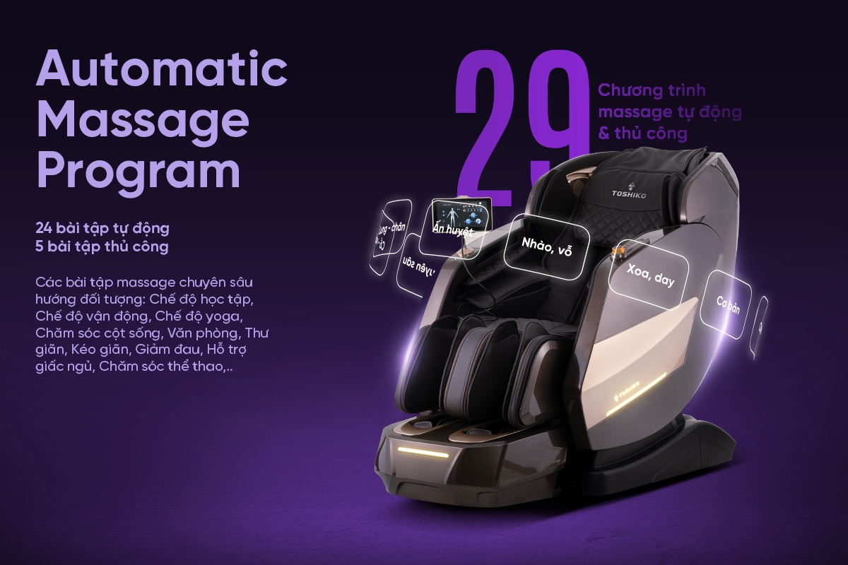 Toshiko T-450 cung cấp 24 chương trình massage tự động + 5 bài tập thủ công, được xây dựng dựa trên những nghiên cứu kỹ lưỡng về sở thích và mong muốn của người dùng Việt, hướng đến nhóm đối tượng cụ thể. Trong đó nổi bật có các bài tập như: Chế độ học tập, Chế độ vận động, Chế độ yoga, Chăm sóc cột sống, Văn phòng, Thư giãn, Kéo giãn, Giảm đau, Hỗ trợ giấc ngủ, Chăm sóc thể thao,…