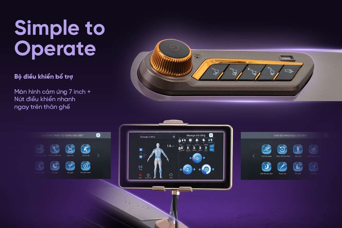 Bên cạnh đó, người dùng cũng có thể thao tác nhanh qua màn hình cảm ứng 7 inch và nút điều khiển nhanh tích hợp trên thân ghế. Không đòi hỏi quá nhiều nút nhấn phức tạp, nút bấm to và biểu tượng. Đặc biệt lý tưởng cho các gia đình có người cao tuổi cùng chung sống.