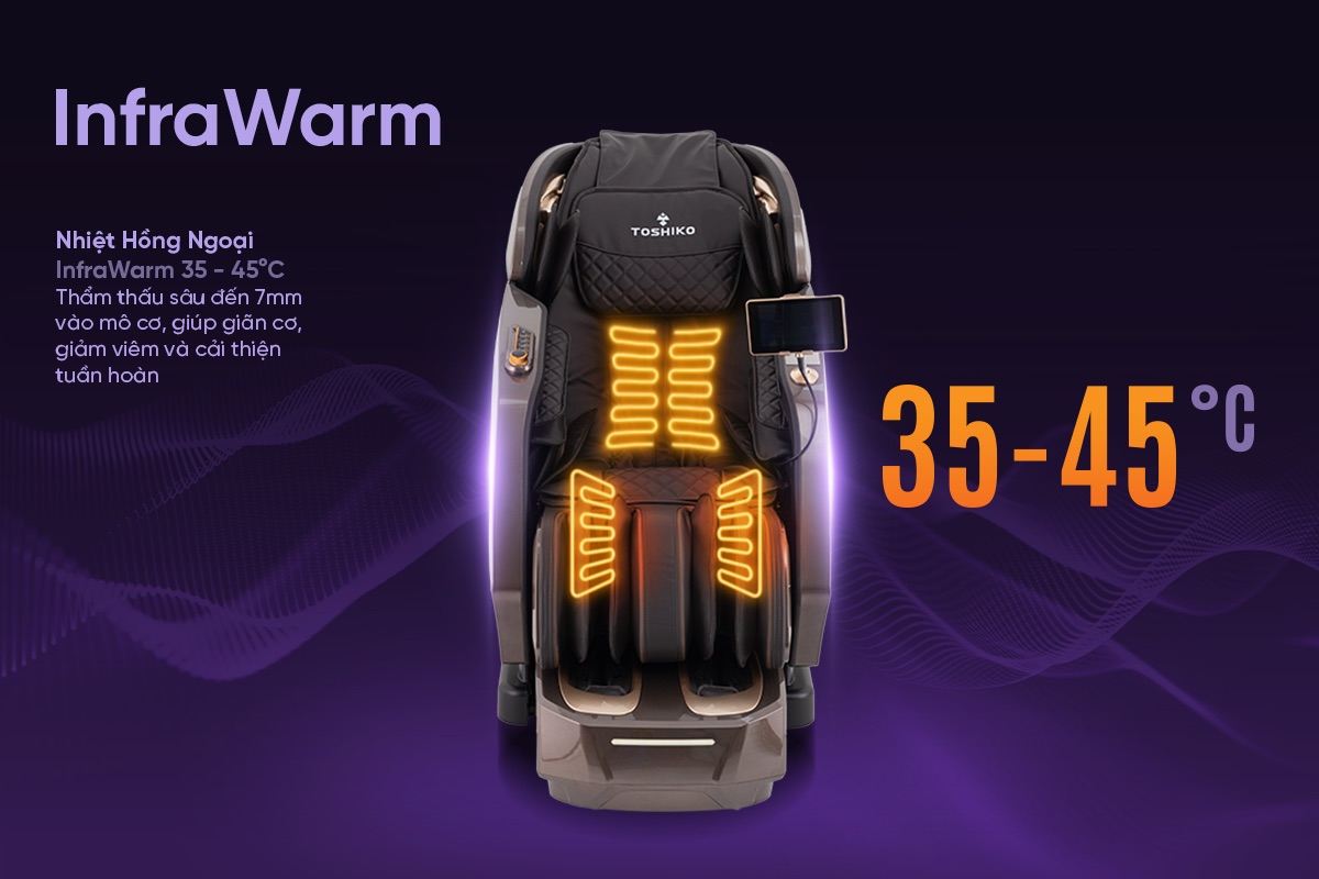 T-450 ứng dụng công nghệ InfraWarm với cơ chế trị liệu tương tự như chườm đá nóng. Sử dụng bước sóng 400 – 800nm, dải nhiệt độ ổn định 35 – 45°C, thẩm thấu sâu đến 7mm vào mô cơ, giúp giãn cơ, giảm viêm và cải thiện tuần hoàn. Công nghệ này đặc biệt hiệu quả với người ai mắc chứng đau lưng mãn tính hoặc lạnh chân tay, khó ngủ sâu do đau nhức xương khớp.