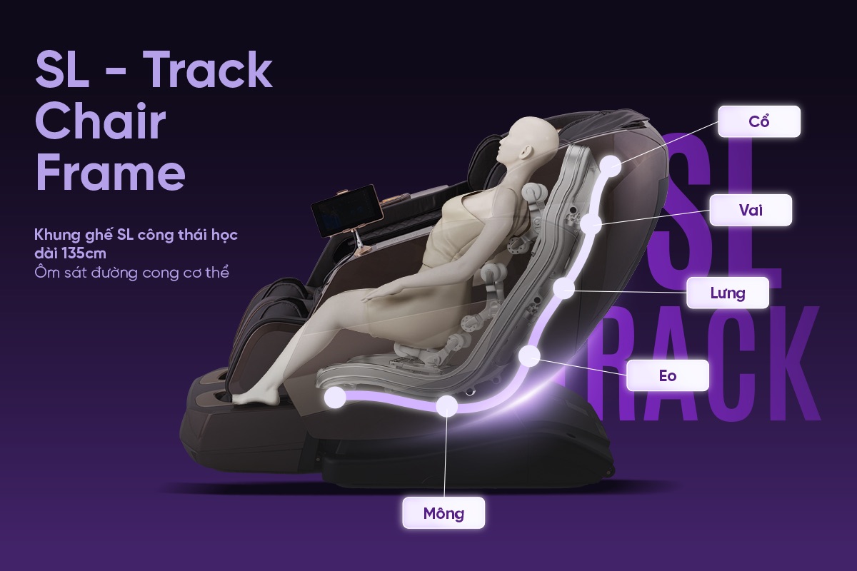 Thiết kế khung Ergonomic SL-Track công thái học dài đến 135cm cho phép con lăn di chuyển liền mạch từ cổ – vai – lưng – eo – mông đến đùi, đảm bảo tăng vùng tiếp xúc lên hơn 20% so với khung truyền thống. Kết hợp với công nghệ massage 360°TheraTouch 4D hệ thống này giúp kích thích lưu thông máu, giảm áp lực vùng thắt lưng. Đồng thời giúp thả lỏng cơ thể và các cơ, đem đến cảm giác dễ chịu khi nằm.