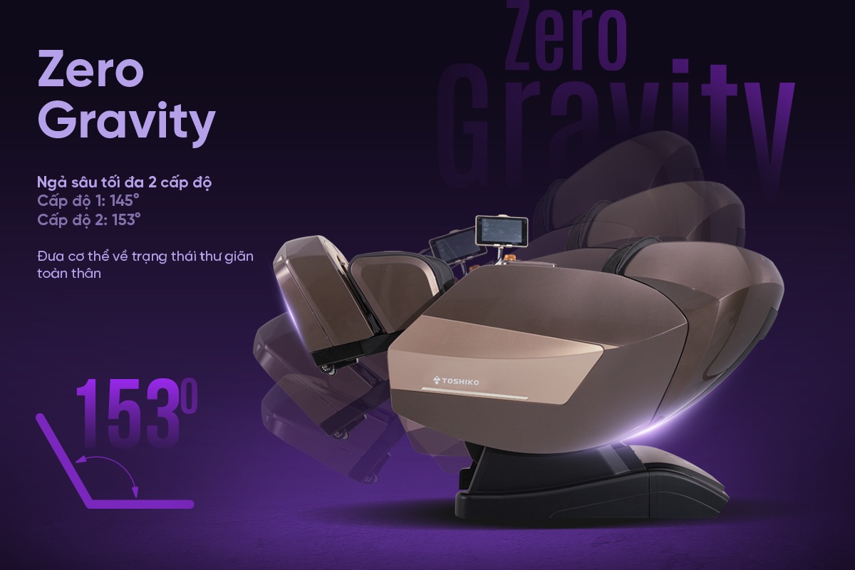 Chế độ Zero Gravity đa cấp độ (145° và 153°), đưa thân người vào tư thế không trọng lực với phần chân được nâng cao. Nhờ đó, giúp giảm áp lực lên cột sống và đĩa đệm, hỗ trợ tái hydrat hóa và giải phóng axit lactic trong cơ bắp, mang lại trạng thái thư giãn sâu và phục hồi thể chất tối ưu.
