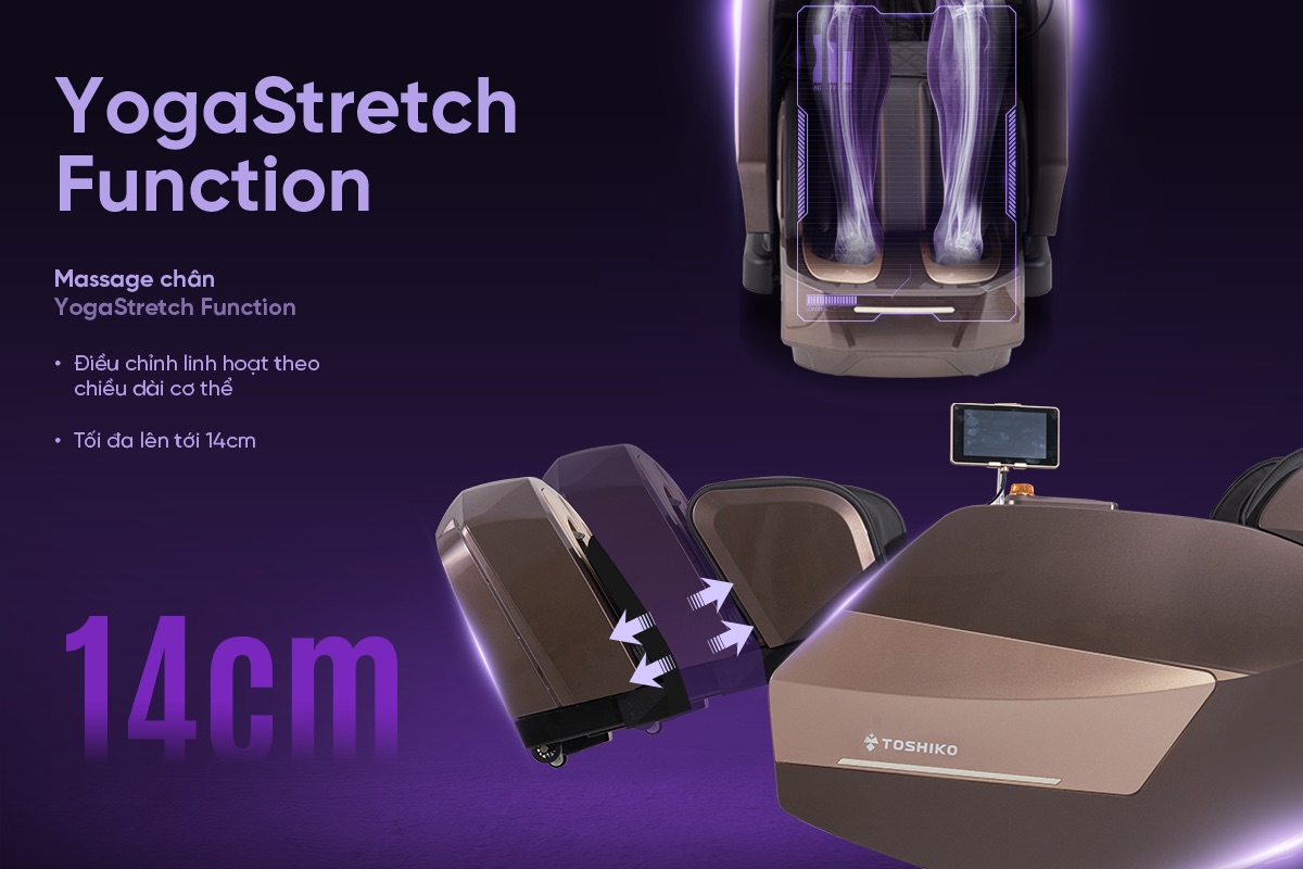 Toshiko T-450 tích hợp công nghệ YogaStretch Function, mô phỏng các động tác kéo giãn trong yoga, giúp thư giãn toàn thân và hỗ trợ phục hồi cơ sâu.