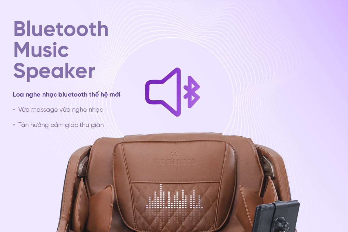 Ghế massage T90 được trang bị loa nghe nhạc bluetooth chất lượng cao ở ngay đầu ghế, tạo nên không gian âm thanh bao quanh toàn bộ vùng nằm massage. Âm thanh trong trẻo, dải tần rộng, mang đến cảm giác như đang nằm giữa một rạp hát cá nhân tại gia. Chỉ cần kết nối nhanh chóng với smartphone hoặc tablet qua Bluetooth, người dùng có thể bật/phát nhạc dễ dàng.