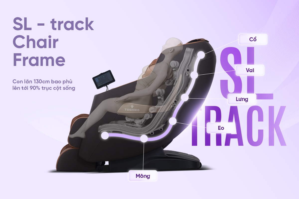 Ghế massage Toshiko T90 sở hữu khung SL dài 130cm, uốn cong theo đúng đường cong cơ thể từ gáy – lưng – thắt lưng – mông – đùi, giúp con lăn bao phủ lên tới 90% trục cột sống. Nhờ đó, các kỹ thuật massage được duy trì liền mạch, giảm cảm giác ngắt quãng, tăng cường hiệu quả trị liệu giảm đau và kích hoạt lưu thông khí huyết.