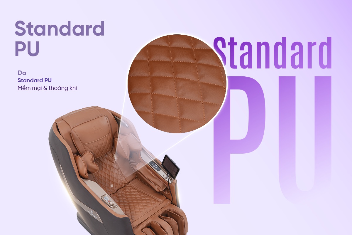 Bề mặt ghế được hoàn thiện bằng chất liệu da Standard PU, nổi bật với độ bền cao và khả năng chống thấm nước vượt trội. Chất liệu này không chỉ mang lại cảm giác êm ái, mềm mại khi tiếp xúc mà còn dễ dàng làm sạch, kháng khuẩn và chống mốc tốt, phù hợp với khí hậu nóng ẩm tại Việt Nam.