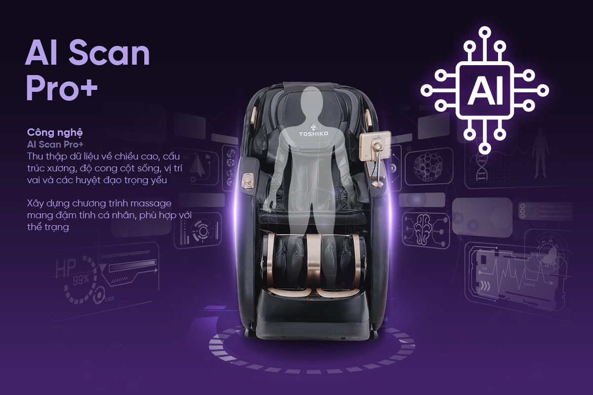 Ghế massage Toshiko T95 ứng dụng công nghệ AI Scan Pro+ độc quyền, cho phép quét dọc toàn bộ cơ thể chỉ trong vài giây đầu của mỗi liệu trình. Hệ thống cảm biến thông minh sẽ thu thập dữ liệu về chiều cao, cấu trúc xương, độ cong cột sống, vị trí vai và các huyệt đạo trọng yếu.